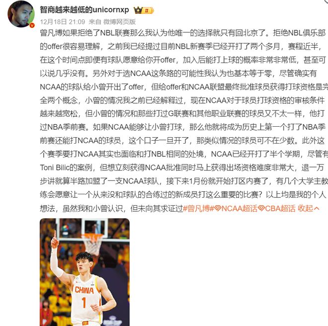曾凡博去NCAA打球的概率也几乎为0,曾凡博是打过NBA季前赛的球员,如果NCAA让一个打过NBA季前赛的球员重返大学打球,一旦这个口子开了,那么更多的美国球员就会效仿,明显不太可能。